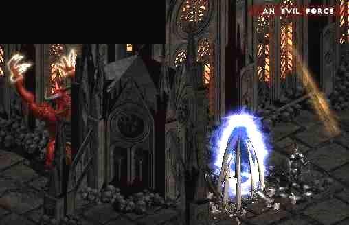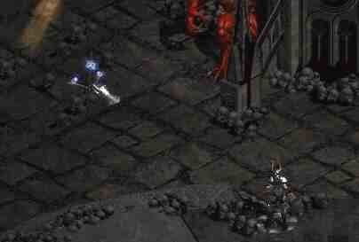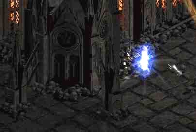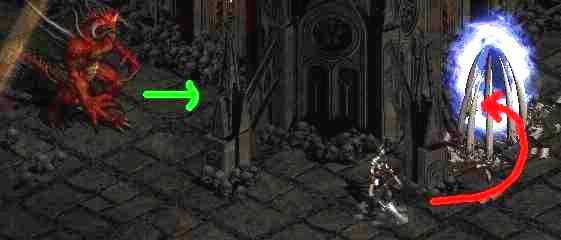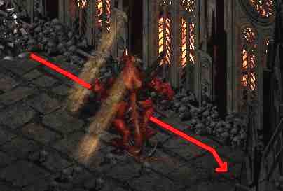 Diablo samozřejmě klec sesílá pouze za určitých okolností a tak je nutné mu tyhle podmínky splnit. Nejjednodušším způsobem, jak jej k seslání klece donutit je, že někde poblíž sešleme town portal. Ideálním místem je prostor okolo toho rohu, který je nad prostorem, kde se Diablo po vypuštění objeví (viz.obrázek). Zde stačí jen na pravé straně postávat a čekat až Diablo klec na portálu obnoví. Potom ji rozbít a zase jen čekat. Další výhodou je, že pokud Diablo zkouší některý ze svých útoků, tak se to všechno vesměs zasekne o ten roh.