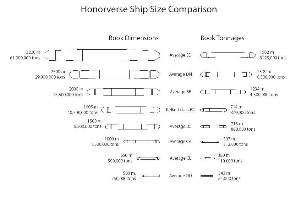 D.Weber předpokládá, že délky lodí budou v dalších knihách a posléze i v dotiscích již vydaných knih opraveny. Je to velmi přibližné, protože střely mají větší hustotu, pláště lodí jsou silné ale možná materiály jsou lehčí než u současných obrněných lodí. Takže nové délky lodí podle Astra games vypadají takto - obrázek převzat z výše uvedené stránky: