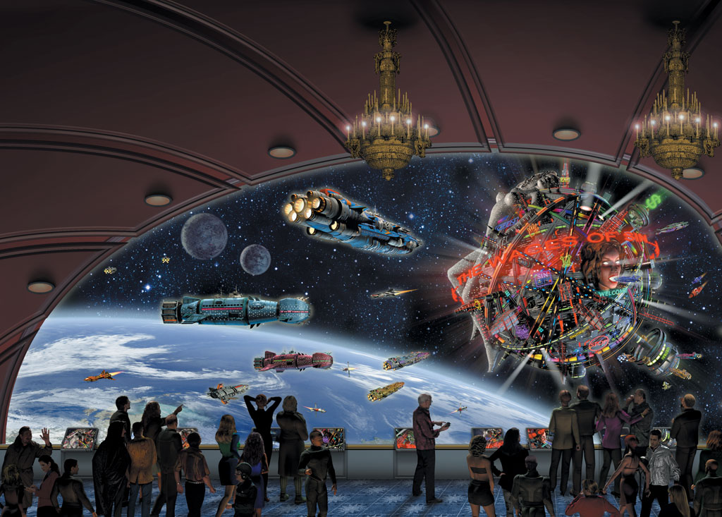 Obálka téhle knížky mě vždycky spíš odpuzovala, speciálně ta hlava s vytřeštěnýma očima. Až z celkového obrázku, který byl podkladem pro obálku (vpravo, klikněte pro zvětšení), je vidět, o co jde. Animace níže zas ukazuje, že je to celé takový reklamní slepenec ...