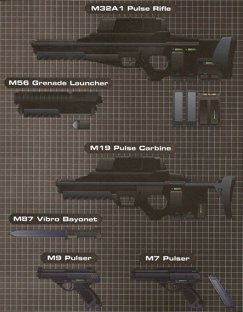 Standardní zbraní RMMC je M32A1 gravitační-pulzní puška ráže 4x37 mm. M32 má dvě zásobníkové šachty, z nichž každá pojme jeden 100-ranný zásobník. Standardní napájecí článek M13 je umístěn za zásobníky a dodává energii pro zbraň, zaměřovací subsystém a jakékoliv přslušenství.