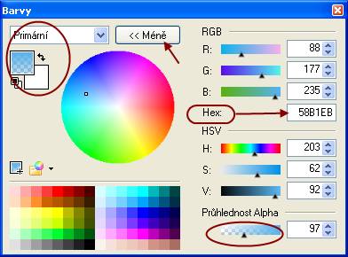 Pozn 2: tu šedou barvu 8C8C8C zadáváte do Okénka barev, když rozkliknete tlačítko "Více", je tam rámeček nazvaný hex (viz obrázek okénka barev výše, je tam šipka)