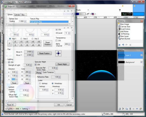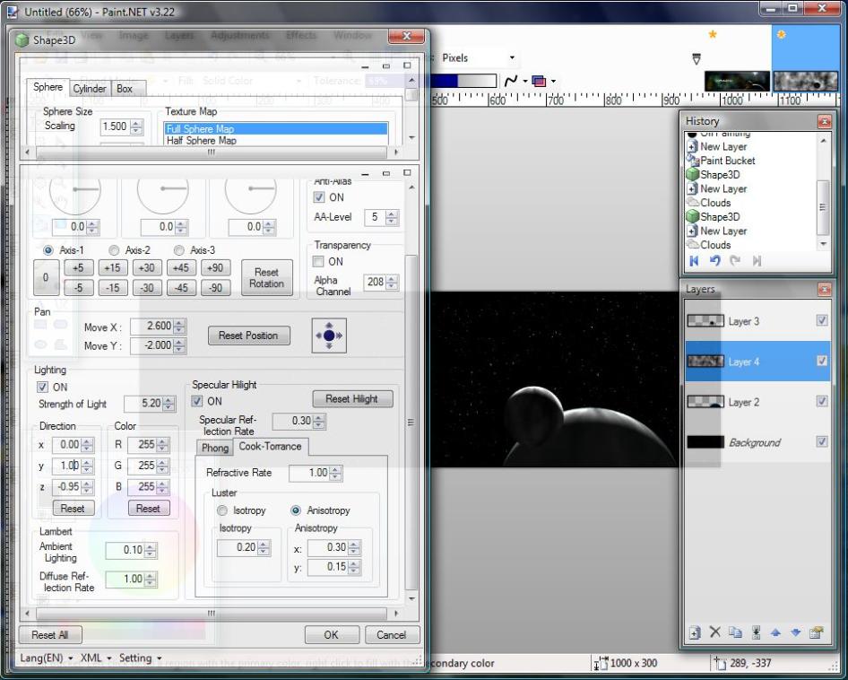 Spusťte Shape3D na vrstvě s mraky. Pamatujte, že měsíc by měl být mnohem menší než planeta. Všimněte si, že jsem změnil hodnotu světla (LIGHT) pro osu „X“ (levý/pravý). Slunce bude lehce do strany od měsíce. Vypadalo by to divně, kdyby to bylo perfektně přímo, jako je to u planety. Vždy pamatujte, že jsou to ty nejjemnější detaily, které skutečně dotváří obrázek.