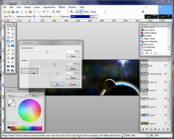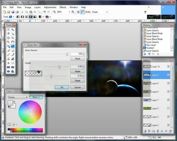 Vraťte se zpátky na základní vrstvu s planetou (tu jednolitou barvu, se kterou jste začínali). Vyberte všechno okolo planety a invertujte výběr. Udělejte novou vrstvu pod vrstvou planety a vyplňte svůj výběr bílou barvou. Udělejte Rozostření zoomem s ohniskem ve středu bílé tečky. Snižte zastření vrstvy aby byla méně znatelná.