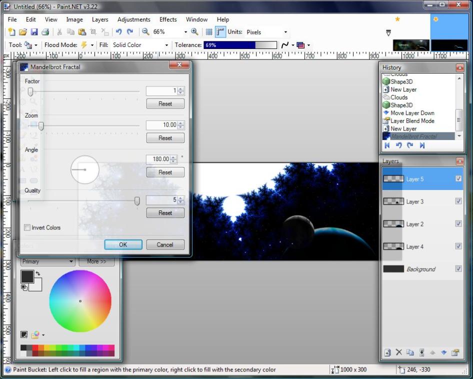 Teď vyrobíme slunce. Jděte na Převod -> Mandelbrotovy Fraktály. Nechte výchozí nastavení kromě úhlu. Nastavil jsem ho na 180. Povšimněte si toho malého výčnělku, který směřuje dolů.