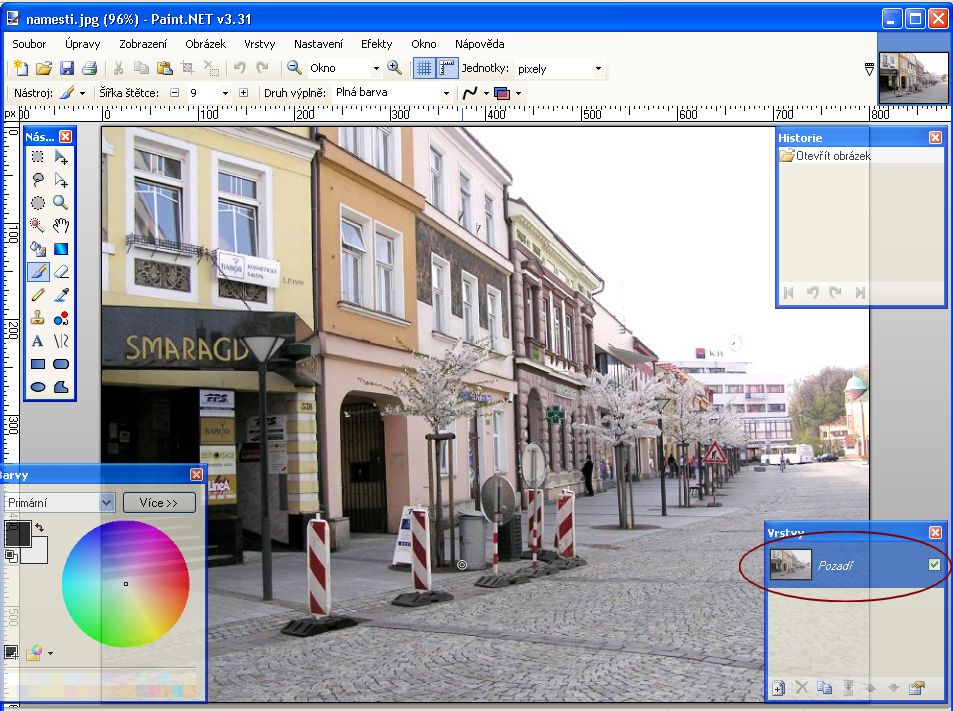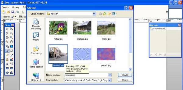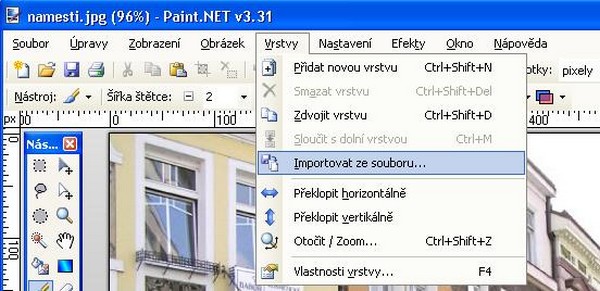Teď potřebujeme otevřít druhý obrázek ale potřebujeme ho dát zvlášť, nad tohle pozadí, tedy do další vrstvy, abychom si první obrázek nepřepsali. Nemá smysl to otvírat jako další nový obrázek. V paint.net sice můžete mít otevřených víc nezávislých obrázků, ale ony jsou pak opravdu nezávislé, takže bychom to stejně museli do další vrstvy nakopírovat.