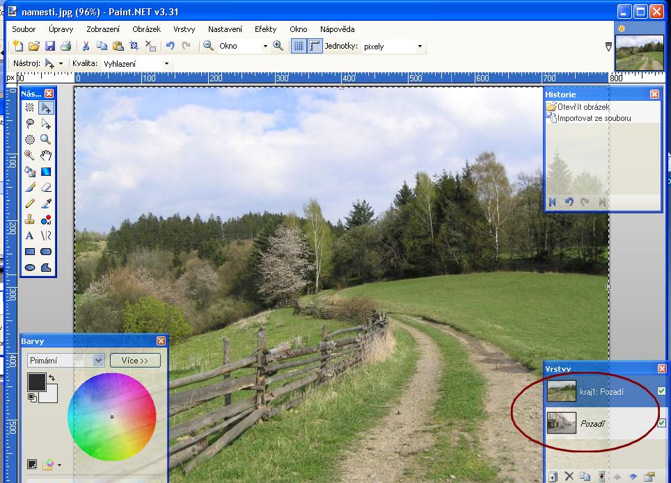 Vypadá to sice, že nový obrázek ten starý „přeplácl“ ale je to jen zdání. Podívejte se do okénka Vrstvy vpravo dole a vidíte, že máme vrstvy dvě. Dole je město, nahoře krajina. Krajina je „aktivní vrstva“ - to je označeno tím modrým pruhem. To je dost důležité a když něco provádíte, je potřeba se podívat, která vrstva je právě aktivní. Lze to změnit kliknutím myši na obrázek vrstvy v tom okénku ale teď to nebudeme potřebovat.