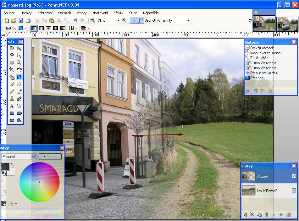 Umístěte myš do středu obrázku, tam, kde by asi mělo začít prolínání, a táhněte se stisknutým levým tlačítkem myši zhruba tak, jak je naznačeno šipkou. Proč zrovna takhle? Kdybyste začali hned u kraje, přechod by byl moc „řídký“, průhlednost by začala nabíhat už od kraje a to nechceme. Chceme jen prolnutí středové části obrázků. Kdybychom ho táhli moc doprava, protahovalo by se prolnutí daleko do „lesa“. Kdyby byl tah jen krátký, byly by „hrany“ přechodu moc ostré.