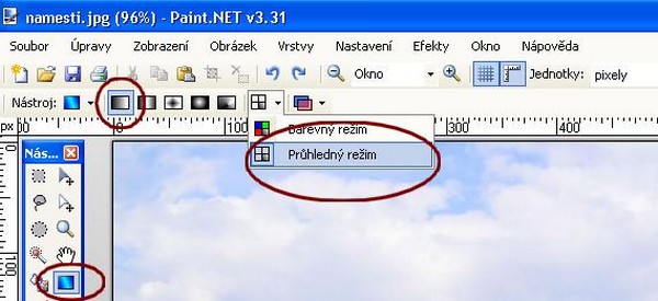 Potřebujeme přechod z jednoho obrázku do druhého – jo, to je přesně to slovo – Přechod. Pokud vám to zní podezřele, je teď ta vhodná chvíle přečíst si nápovědu k přechodům v článku Barevné a průhledné přechody. V panelu nástrojů vyberte nástroj pro přechod