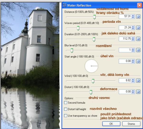 - Distance: kde začne odraz vody v procentech výšky obrázku. Hodnoty od 0 až 400, výchozí je 50 (střed obrázku)