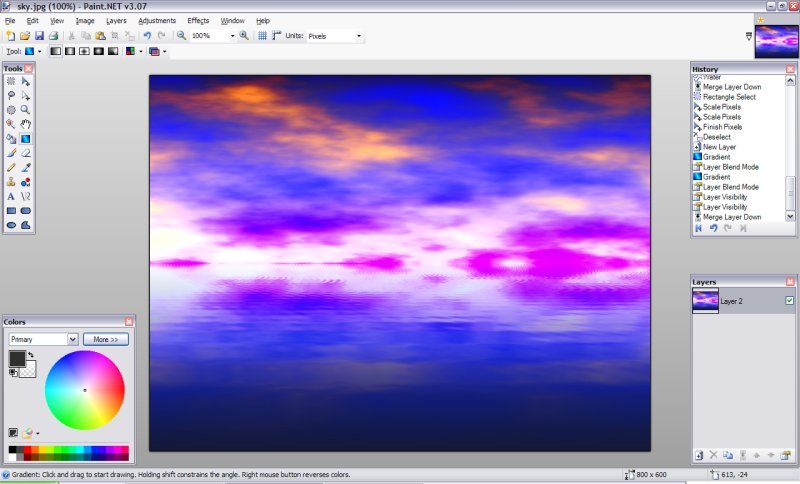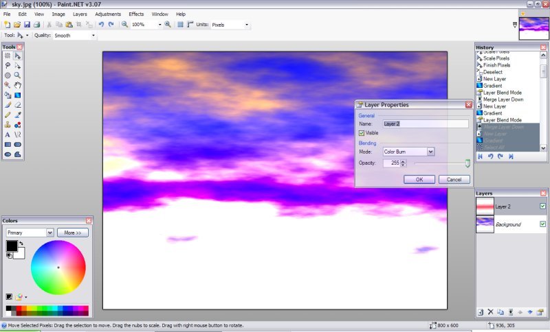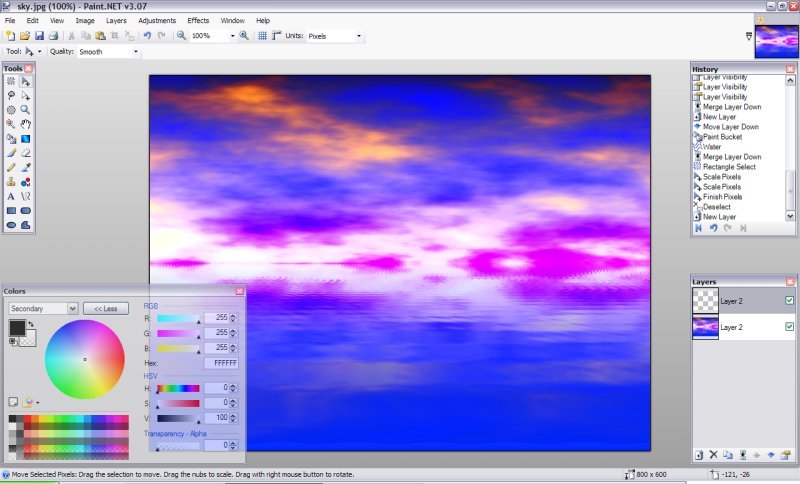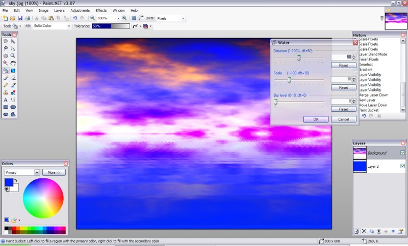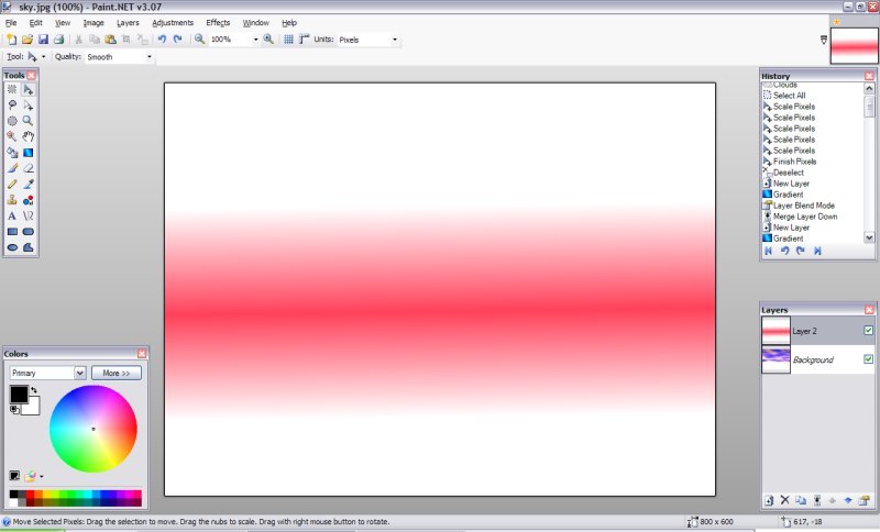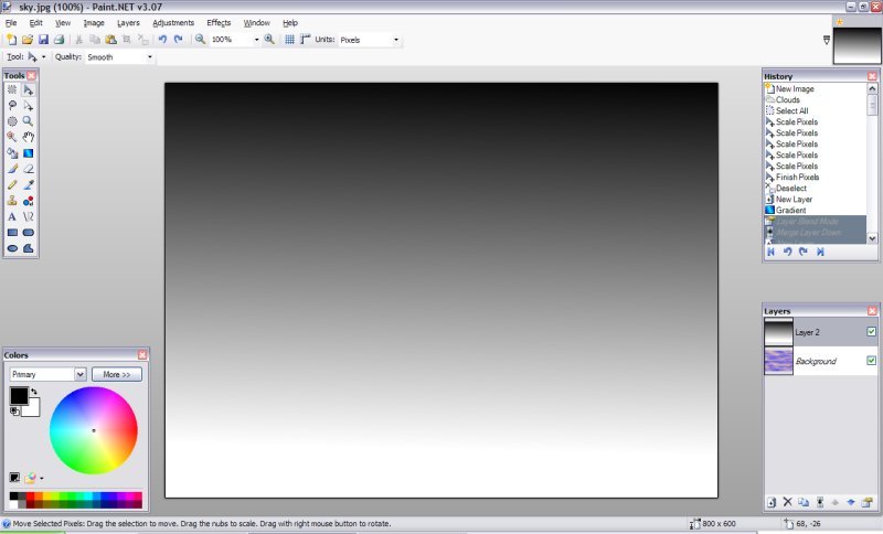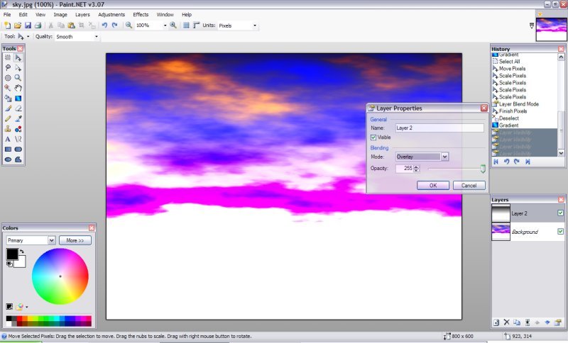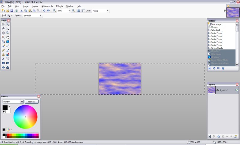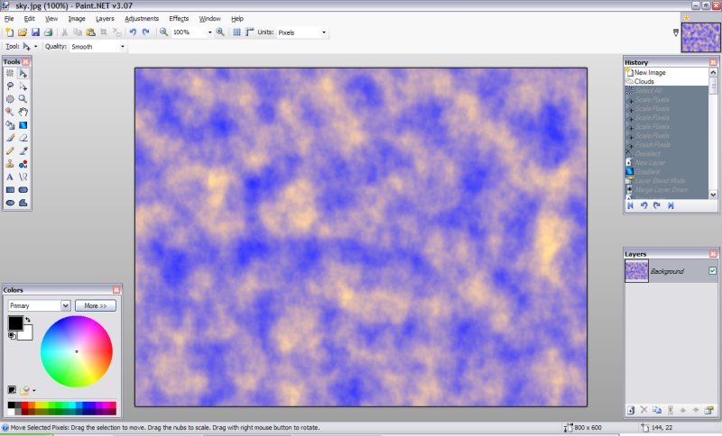 1.Vytvořte nový obrázek a vyberte barvy, které chcete pro oblohu, udělejte Efekty -> Převod ->Mraky