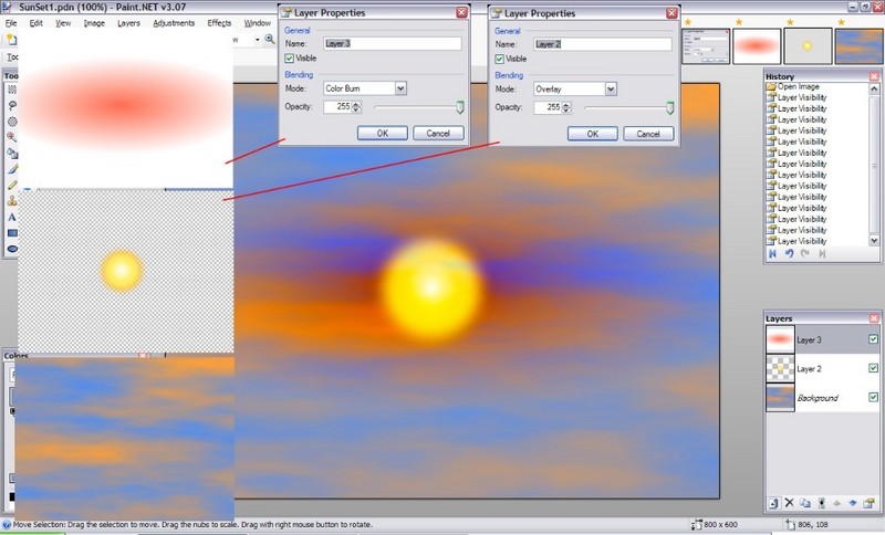 Pro Slunce použijte Efekty -> Fotografie -> Žhnutí, pak Efekty ->Rozostření -> Gaussovo rozostření a Rozostření Zoomem, v jakémkoli pořadí. Režim míchání vrstvy nastavte na Překrytí.