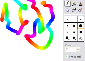 Je vìtí výbìr nástrojù na kreslení co do formy i moností. Volba "duha" umoòuje kreslit barevný gradient na vrstvì.