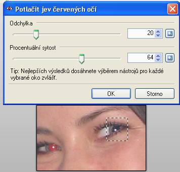 Otevřete obrázek. Vyberte, třeba obdélníkovým výběrem, oblast okolo oka. Je lepší dělat každé oko zvlášť ale můžete zkusit vybrat i obě dohromady. V horním menu zvolte Efekty / Fotografie / Potlačit jev červených očí -