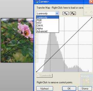 Tento plugin podstatně vylepšuje a rozšiřuje funkce Křivek. Nachází se v balíčku pyrochild plugins. (Buď si ho nainstalujte celý nebo jen Curves+.dll a Pyrochild.effects.common.dll do adresáře Effects). Výhodou zde je, že vidíte histogram (viz obr níže), máte více možností a v menu advanced můžete dokonce nahrazovat či upravovat barvy, průhlednost, sytost ...