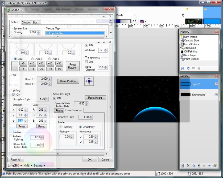 Spusťte Shape3D na vrstvě s mraky. Pamatujte, že měsíc by měl být mnohem menší než planeta. Všimněte si, že jsem změnil hodnotu světla (LIGHT) pro osu „X“ (levý/pravý). Slunce bude lehce do strany od měsíce. Vypadalo by to divně, kdyby to bylo perfektně přímo, jako je to u planety. Vždy pamatujte, že jsou to ty nejjemnější detaily, které skutečně dotváří obrázek.