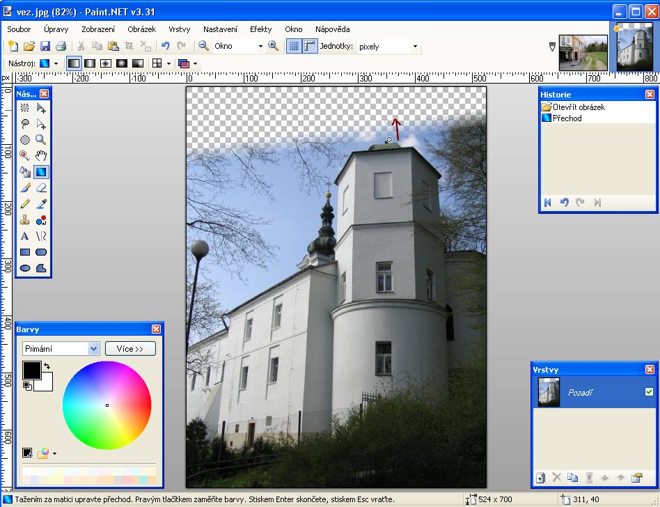 Napřed se zbavíme horní části oblohy nad věží. Zvolte v Panelu nástrojů nástroj Přechod  . V horní liště ponechte volbu Lineární  , a zvolte přechod do průhlednosti  . Táhněte krátký přechod nad věží zespoda nahoru. Na rozdíl od předešlého návodu nemáme spodní vrstvy a tak vidíme šedou šachovnici, která indikuje prázdnotu téměř vesmírnou. Potvrďte přechod pomocí ENTER. Toho, že při nasazení myši na počátek dráhy celý obrázek zprůhlední (šachovnice), se neděste, on se zase objeví, až začnete tahat přechod.