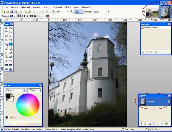 Otevřete si obrázek z minulého návodu a dále otevřete obrázek věže z menu Soubor ->Otevřít. Obrázek se otevře jako nový samostatný obrázek v paint.net. Všechny změny, které na něm budete dělat, se budou týkat pouze tohoto obrázku.